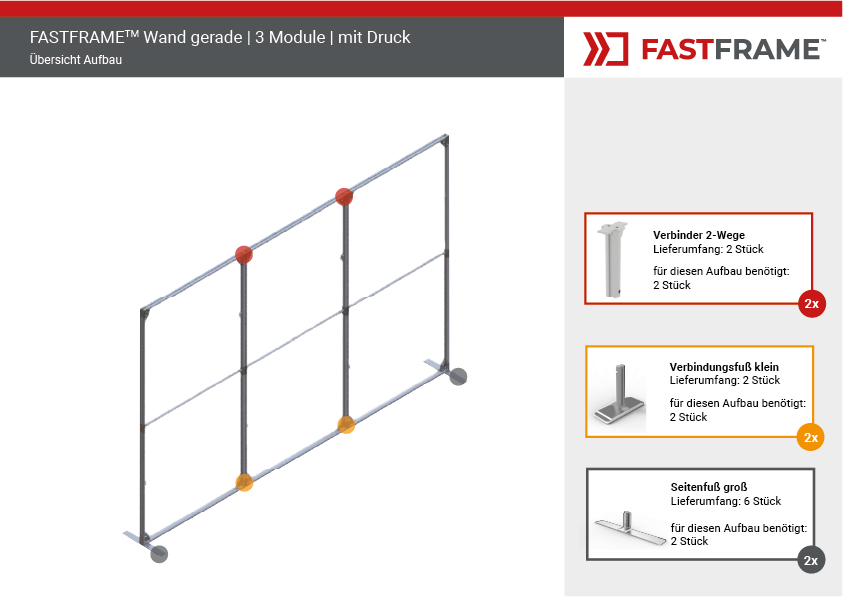 Der FASTFRAME™ gerade Wand mit 3 Modulen ist die ideale Lösung für professionelle Präsentationen, Messen und Events. Dank seines leichten, vormontierten Aluminiumrahmens mit 40 mm Profil lässt er sich in Sekundenschnelle aufstellen – ganz ohne Werkzeug. Eine zentrale Stützstange sorgt für zusätzliche Stabilität, während optionale Standfüße den Halt optimieren.